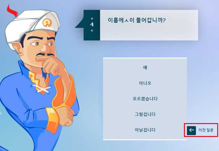 그 다음에는 이런식에 질문이 시작됩니다. 앞에서도 말했지만, 이는 기본적으로 사람 혹은 만화 등에 나온 '인물'을 주로 찾는데요. 경우에 따라서 무생물이나 물건도 찾을 수 있습니다. (ex) 컴퓨터, 이어폰, 청소기)