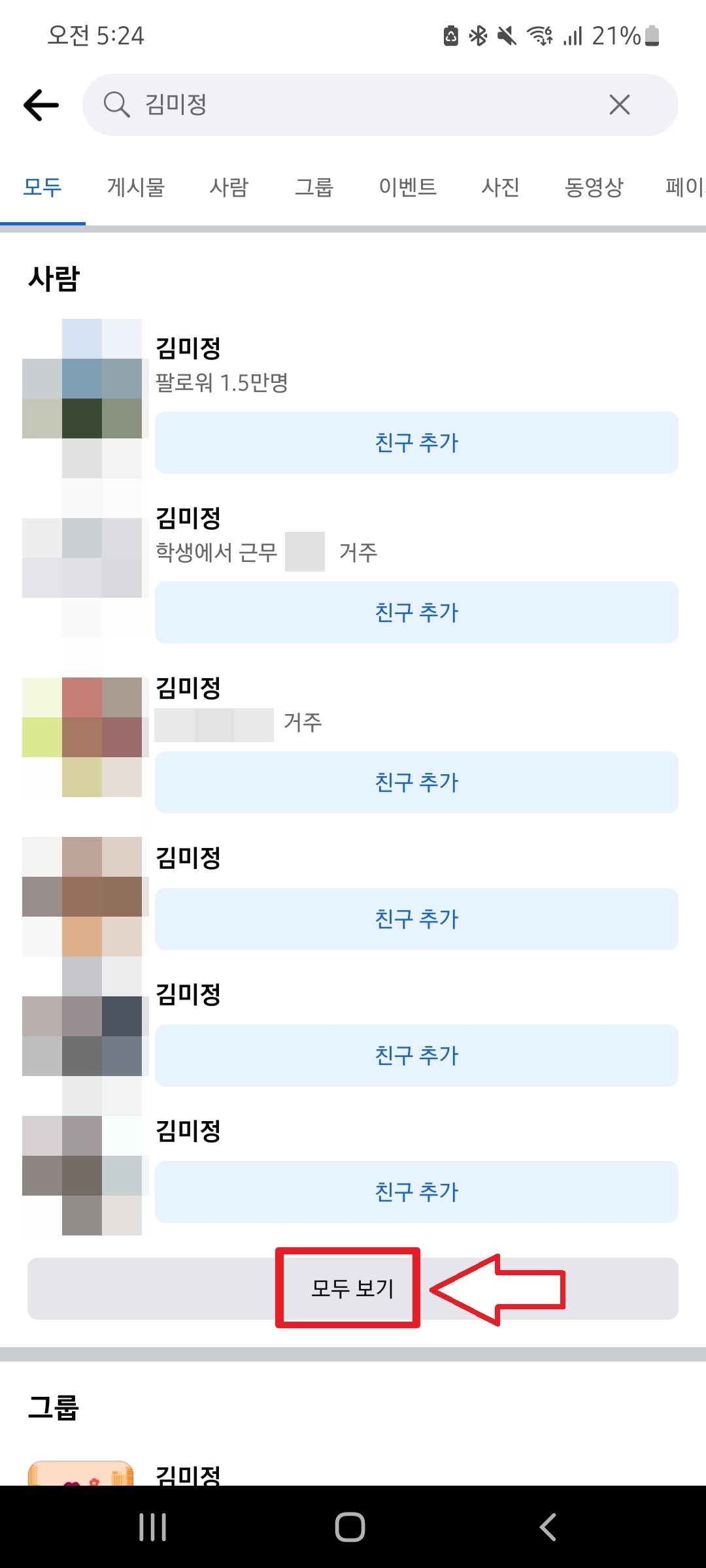 그렇게 이름을 적으면, 그 이름과 관련된 사람들의 목록이 쭉 나오게 됩니다. 이때, 초반에 보면 본인이 사는 지역 혹은 본인이 다녔던 학교, 회사와 관련된 지인들에 정보가 우선적으로 보이는데요. 이를 통해 본인이 찾고 싶었던 지인을 찾아보세요. 또 화면 아래에 있는 '모두 보기' 버튼을 누르면 세부적인 정보를 찾을 수도 있는데요.