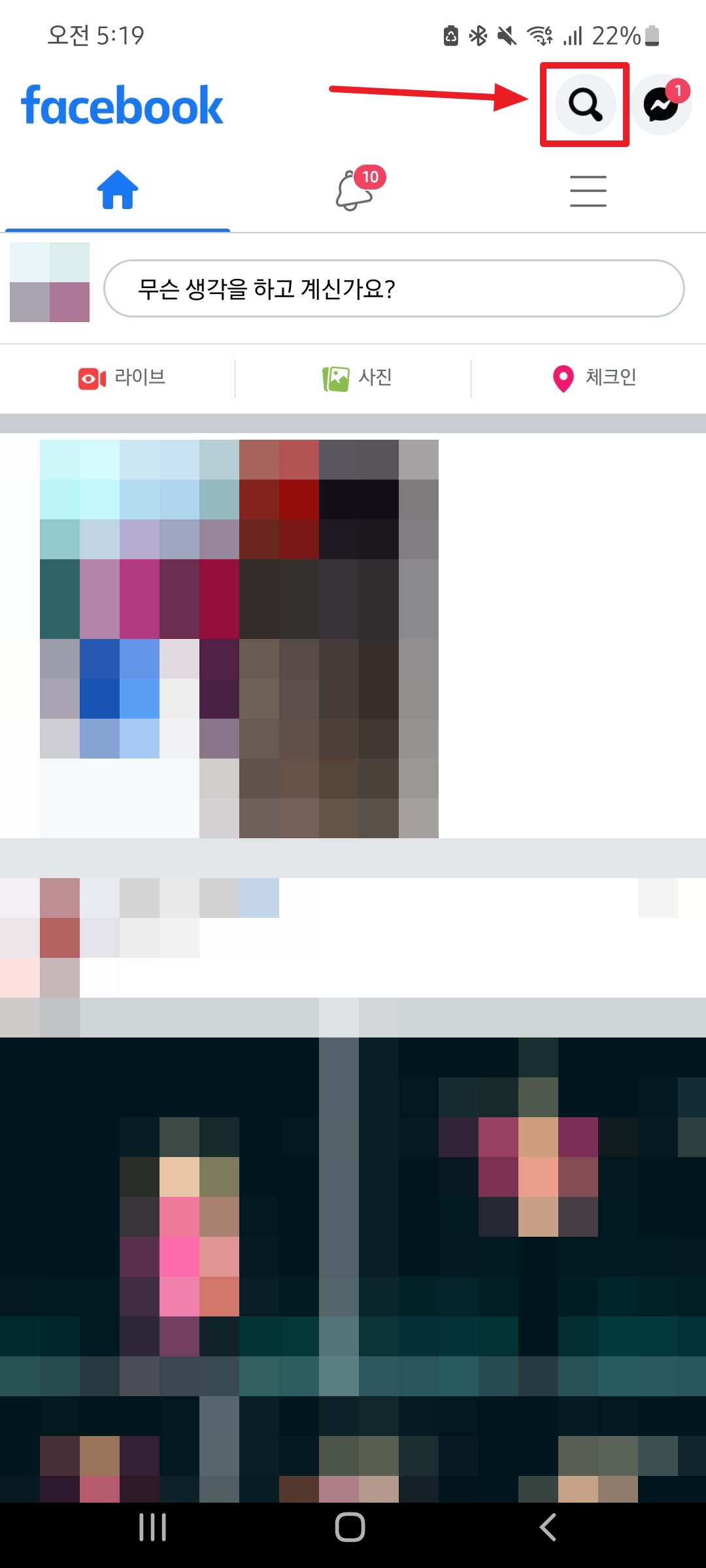 먼저 '페이스북 사람찾기' 방법을 알아보도록 할께요. 우선 안드로이드(바로가기), 아이폰(바로가기) 앱 스토어에서 '페이스북'을 검색해 관련 앱을 받아보세요. 앱을 받고 실행한 다음 로그인을 하면, 이런 식에 기본 화면이 보이는데요. 이때 여기서 다른 것 말고 '오른쪽 위'에 있는 '검색' 아이콘을 클릭해보세요.