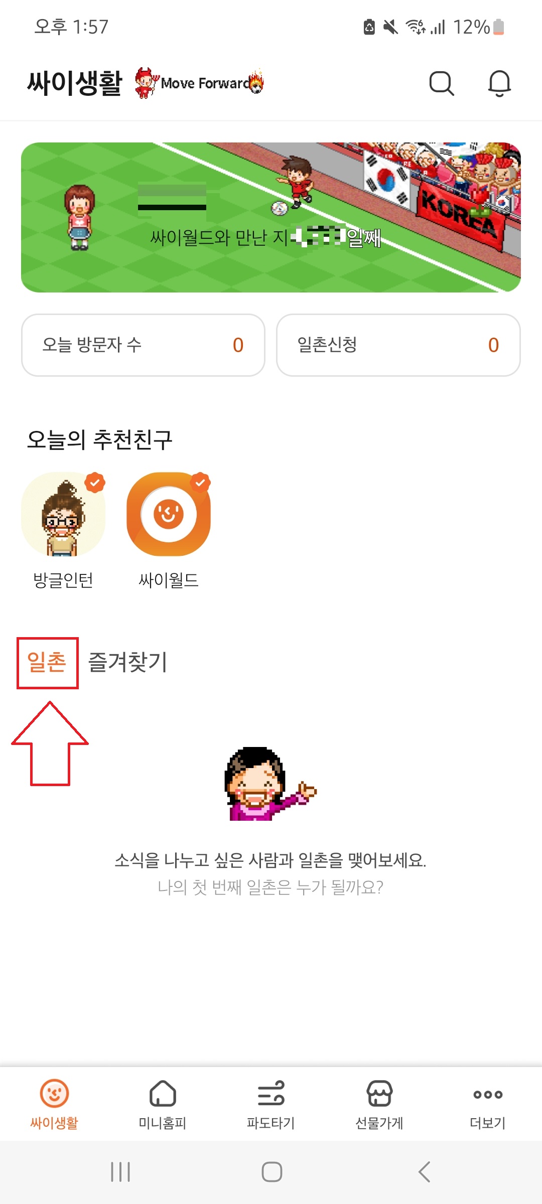 계정을 입력해서 로그인을 하고 나면, 초기에 이런 식으로 본인 계정에 대한 정보가 보이는데요. 이때 이 계정이 예전부터 썼던 계정인 경우, 왼쪽 아래 '일촌' 목록에 일촌이 있으실꺼에요. 이 일촌 목록에서 지인을 찾거나, 일촌 파도타기를 통해 관련 지인을 찾아보시길 바랍니다. 이런 식으로 사람찾기 방법 3가지에 대해 알아봤어요.