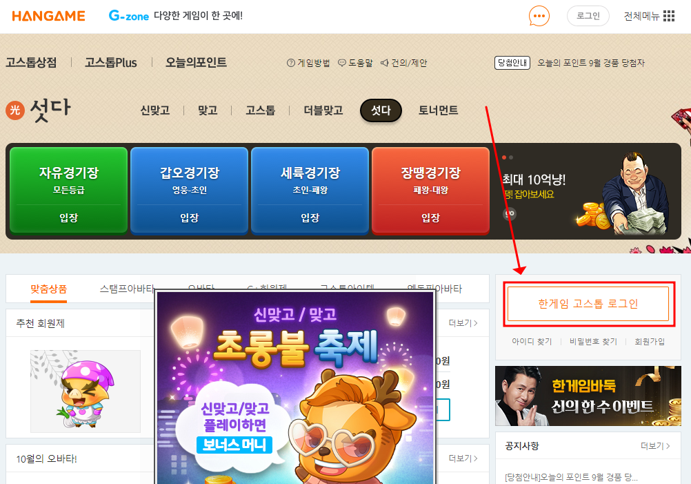 이를 클릭하고 나면, 이런 식의 한게임 섯다 기본 페이지가 보이게 됩니다. 이곳 중간에 보면, 게임 아바타나 이벤트 등에 대한 정보가 나와 있는데요. 이때 이 곳에서 다른 것 말고, 우선 오른쪽에 있는 '한게임 고스톱 로그인' 버튼을 클릭해서 본인의 한게임 계정을 입력해보시길 바랍니다.