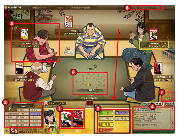 방을 들어가면 이런 식에 게임 화면이 보입니다. 이때 위쪽엔 상대방들의 패가 보이고 아래쪽엔 본인 패가 보이는데요. 여기서 본인 패 맞게 다양한 액션 중에 하나를 선택해서 게임을 진행해보시길 바랍니다. 이런 식으로 'PC'에서 한게임 섯다 게임 하는 방법에 대해 알아봤어요.